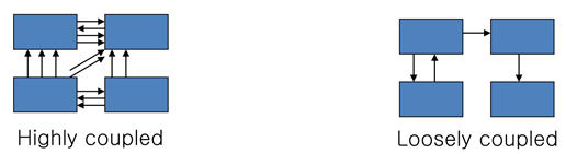 : 프로그램의 코드의 한 종류가 다른 것이 얼마나 결합되어 있는지, 얼마나 의존적인지 나타내는 정도