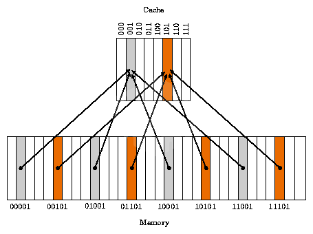 현재 그림에서는 메모리 공간이 32개(00000~11111)이고, 캐시 메모리 공간은 8개(000~111)인 상황