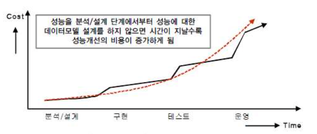 분석/설계단계에서 데이터 모델은 대충하고, 성능이 저하되는 SQL을 튜닝하고, 부족한 하드웨어 용량을 증설하는 등의 작업은 추가적인 비용을 소진하게 하는 원인이 된다.