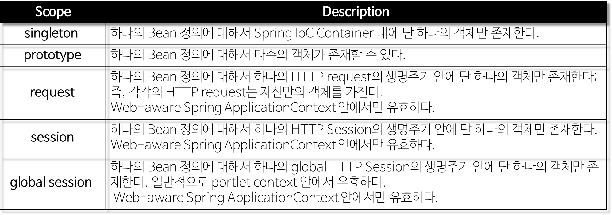 - scope: 객체의 범위 (sigleton, prototype)