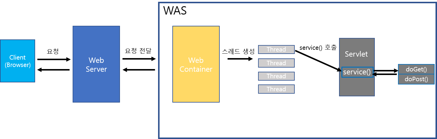 - Servlet Container는 요청이 올 때 마다 새로운 Java threed 하나 생성