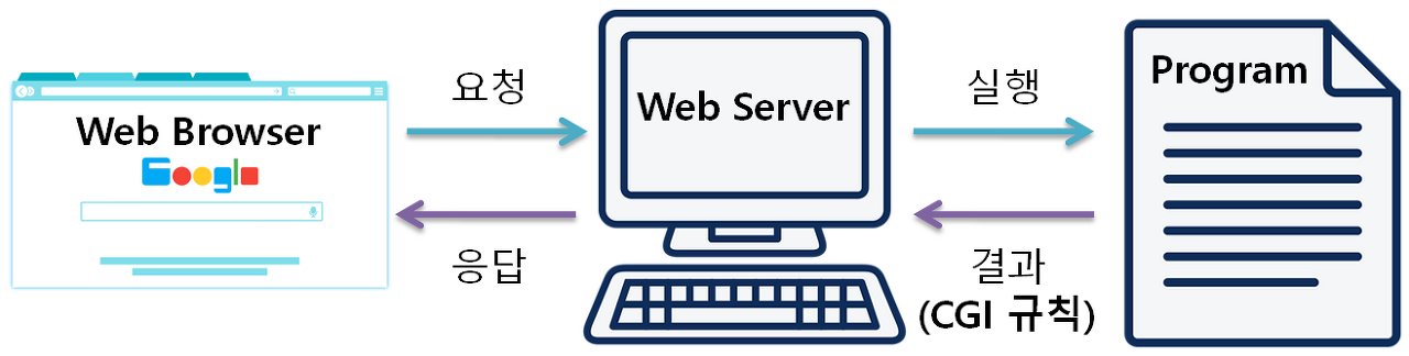 이때 웹 서버와 프로그램 사이의 데이터를 주고받는 규칙을 CGI(Common Gateway Interface)라고 한다.