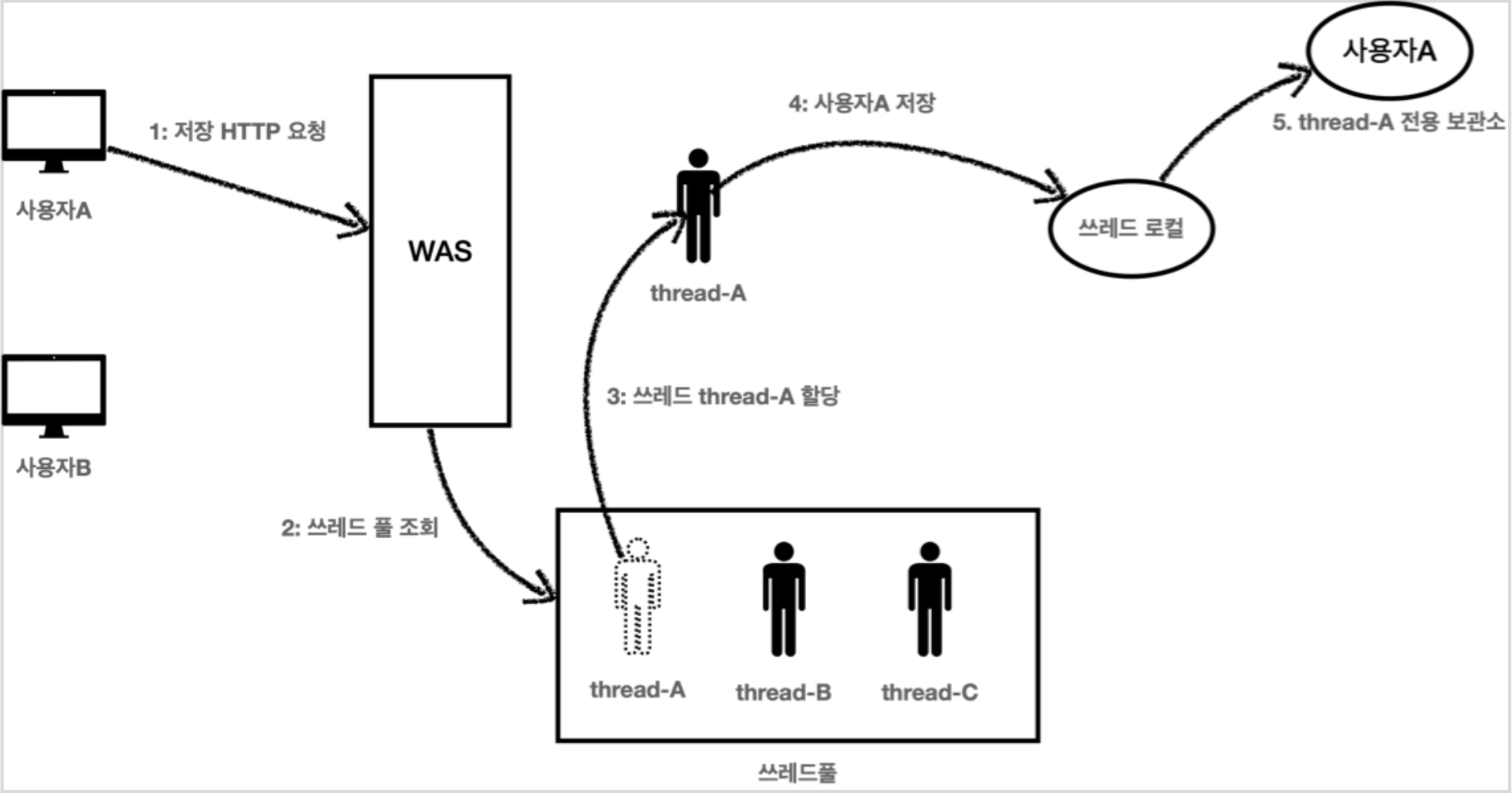 - 사용자A는 WAS에 요청하여 Thread-A를 사용해 사용자 A를 저장후 사용자A에게 HTTP응답을 했다.