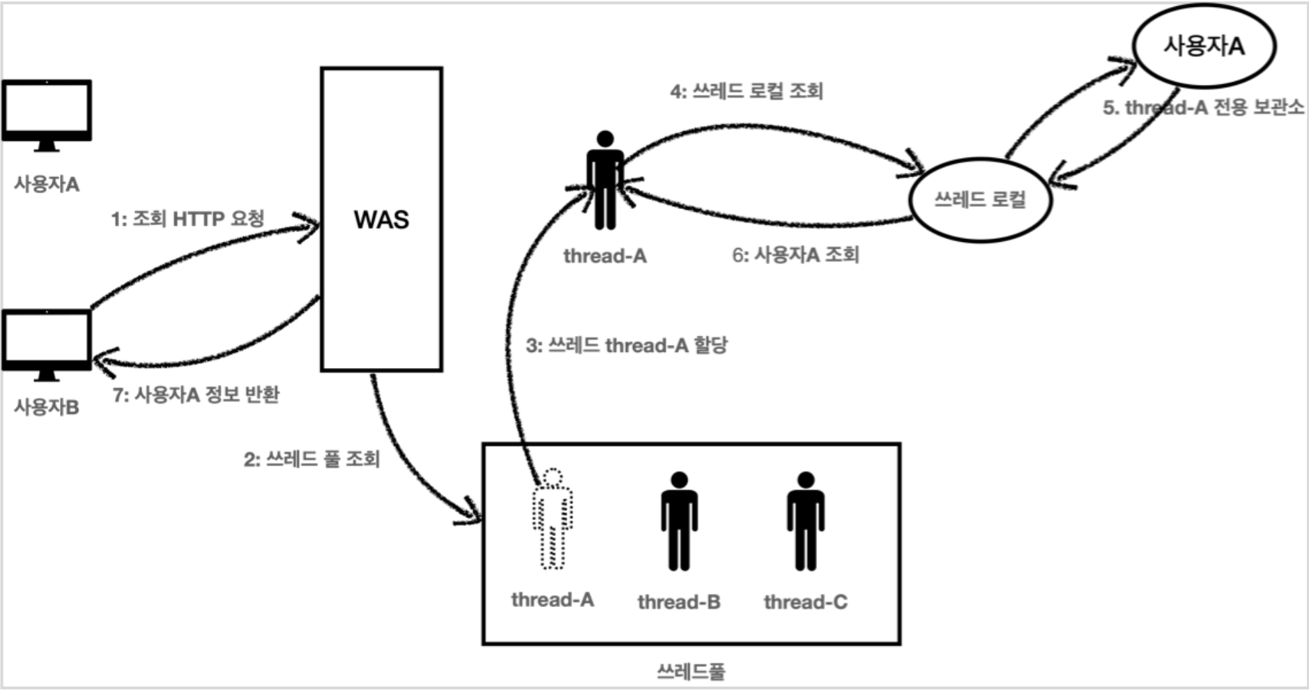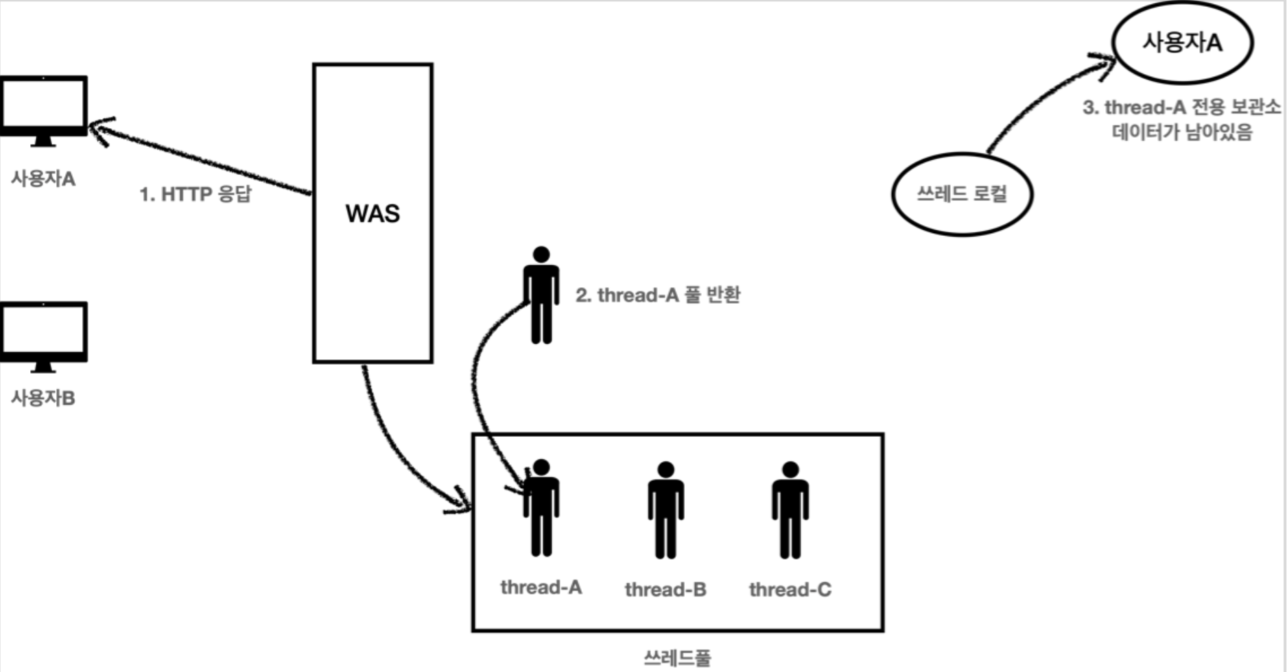 - 사용자A는 요청이 끝나 사용자A가 요청한 로직을 처리한 Thread-A는 Thread Pool에 반환되었다.