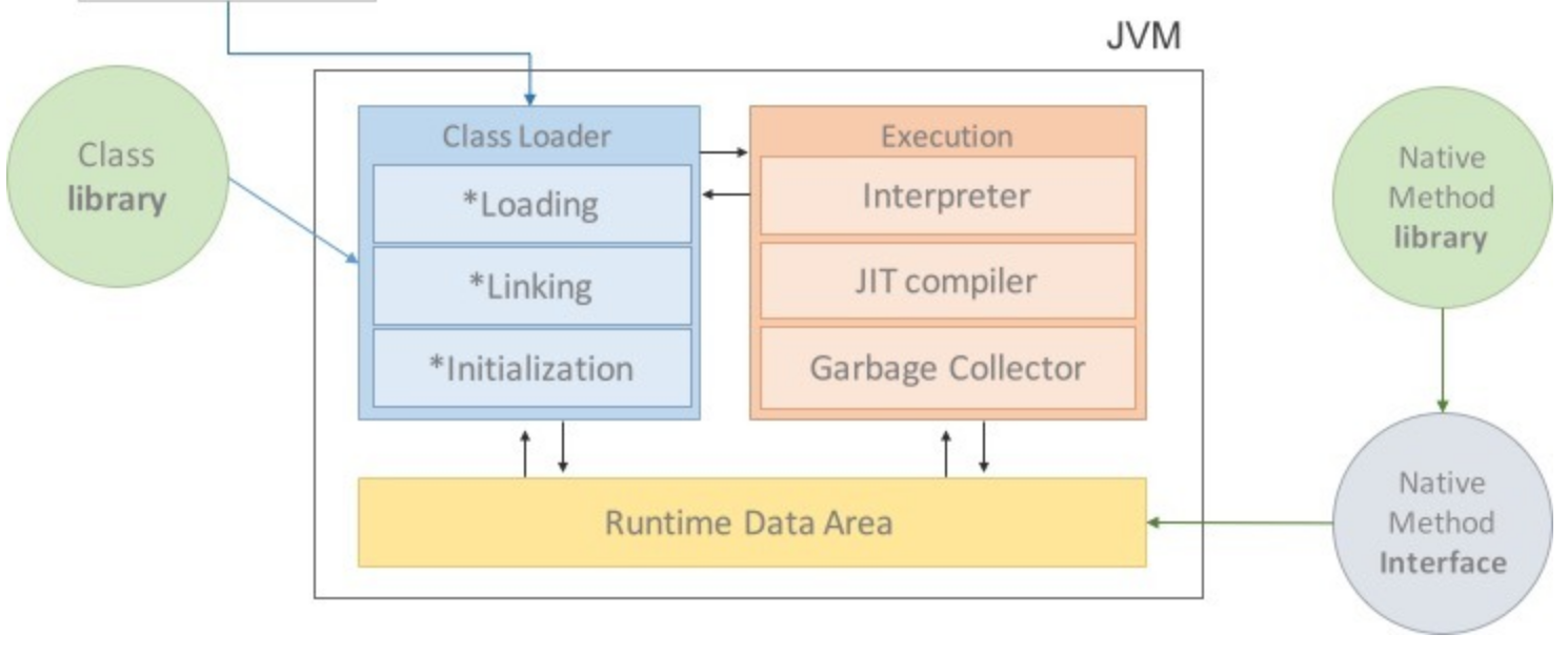 Java byte code를 런타임 데이터 영역(Runtime Data Areas)에 로드하고, 실행 엔진(Execution Engine)이Java byte code를 실행한다.