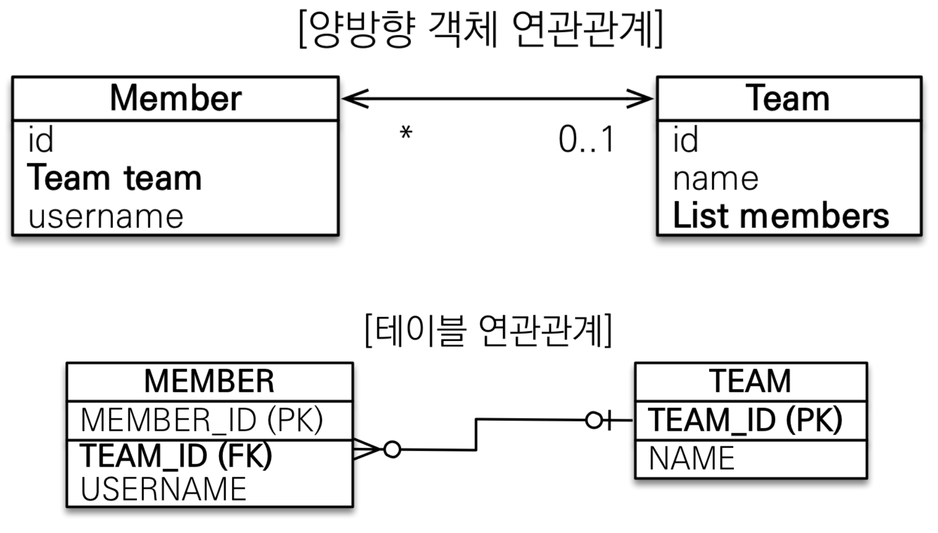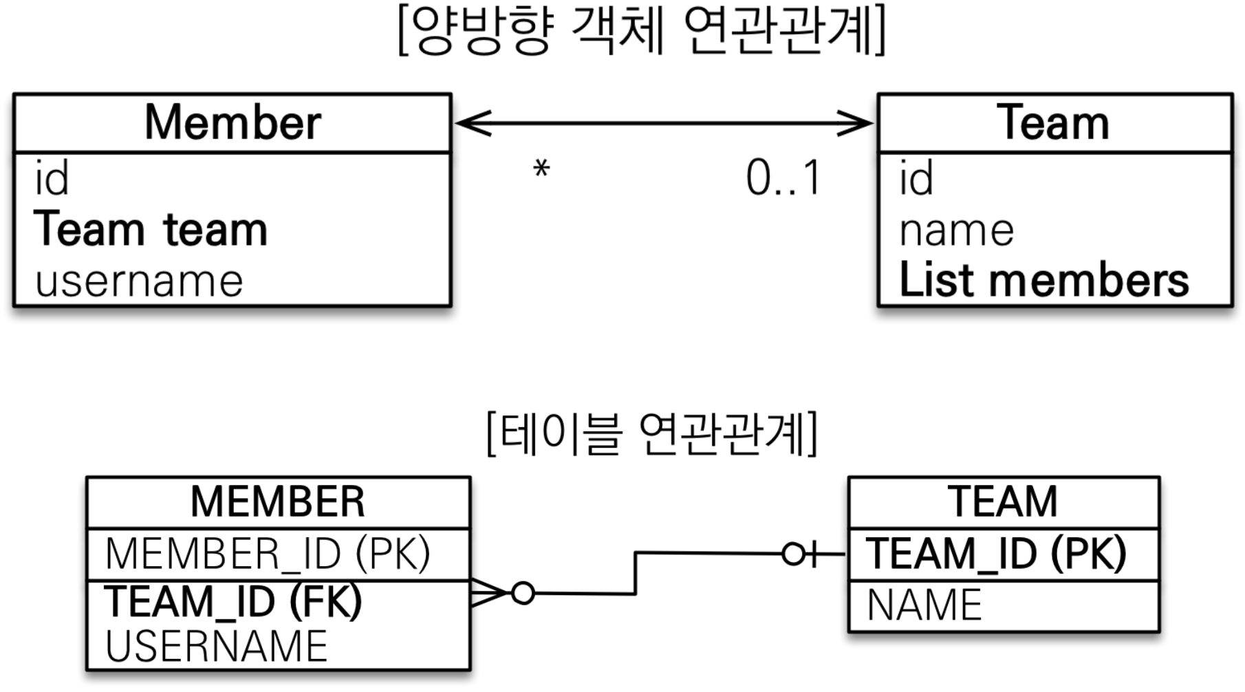 - 객체의 양방향 관계는 사실 서로 다른 방향 관계 2개이다.