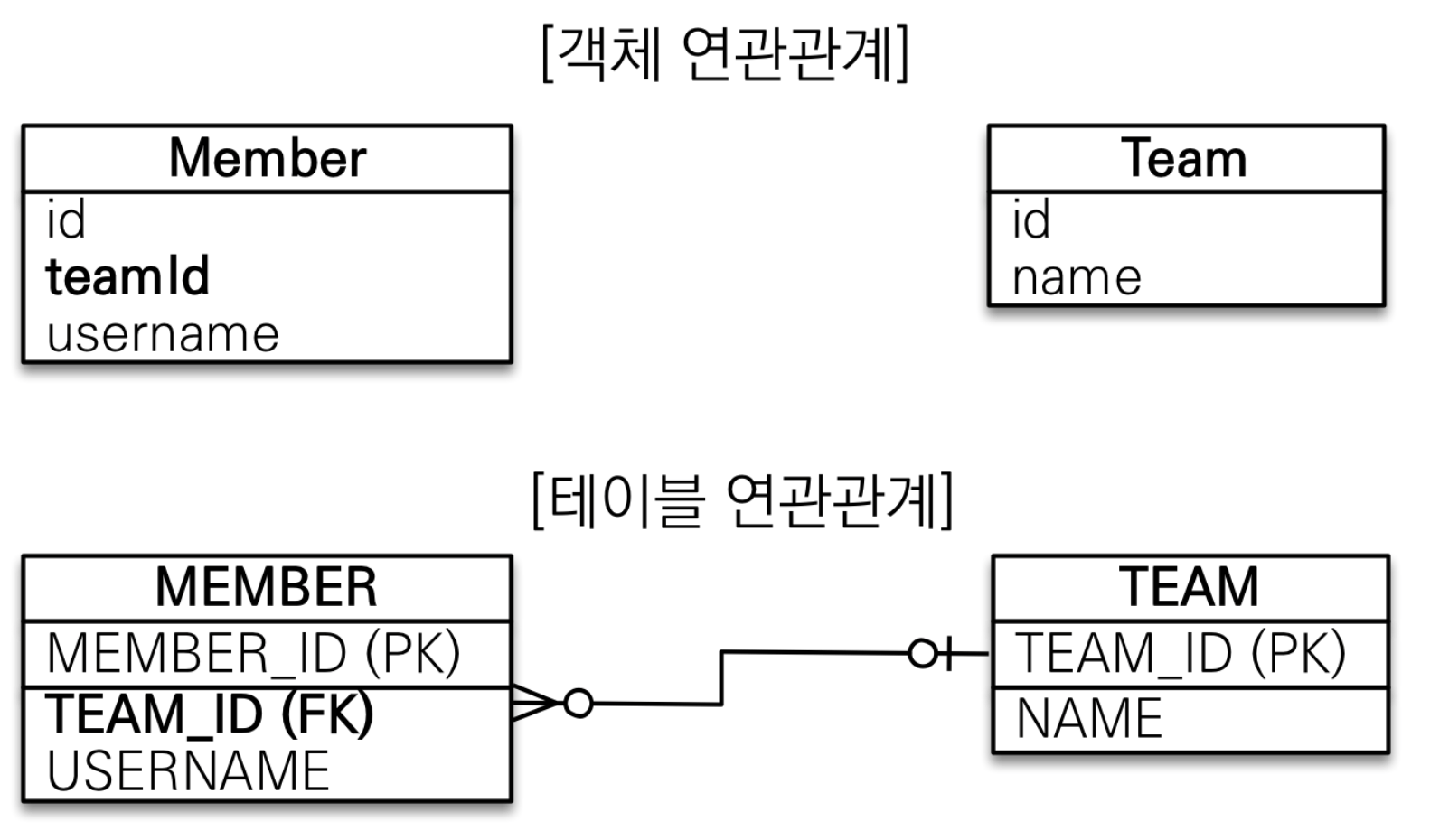 - 외래키 하나로 두 테이블의 연관관계 관리