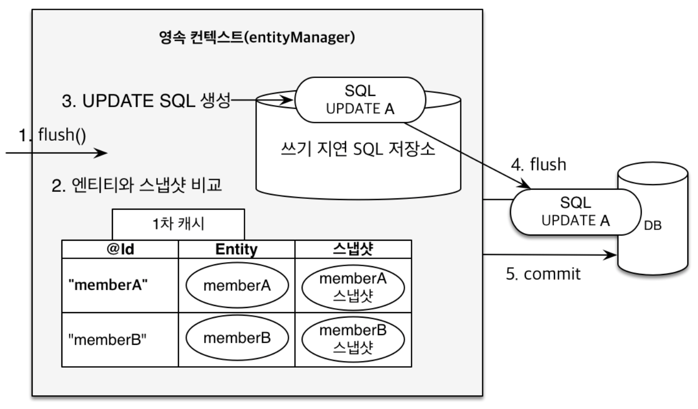 flush()가 호출된다. 1차 캐시의 스냅샷과entity를 비교하여 객체가 변경되었는지 비교한다.- 2번에서 변경사항이 나오면 쓰기 지연