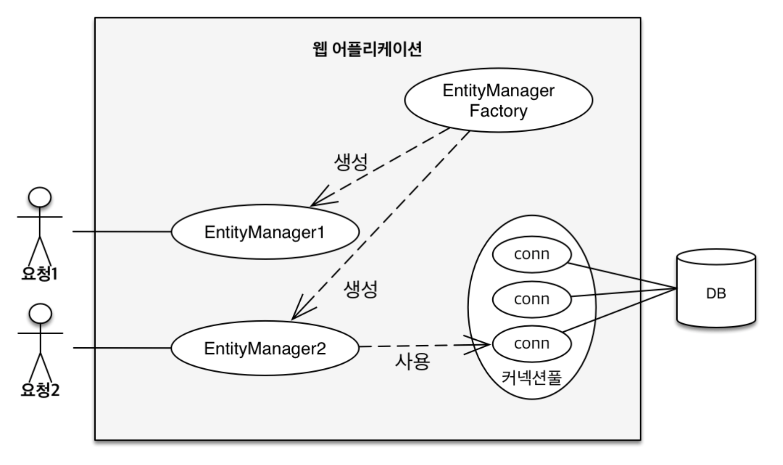 EntityManagerFactory를 통해EntityManager를 생성한다. EntityManager은 내부적으로 커넥션 풀을 사용해서 DB를 사용하게 된다.