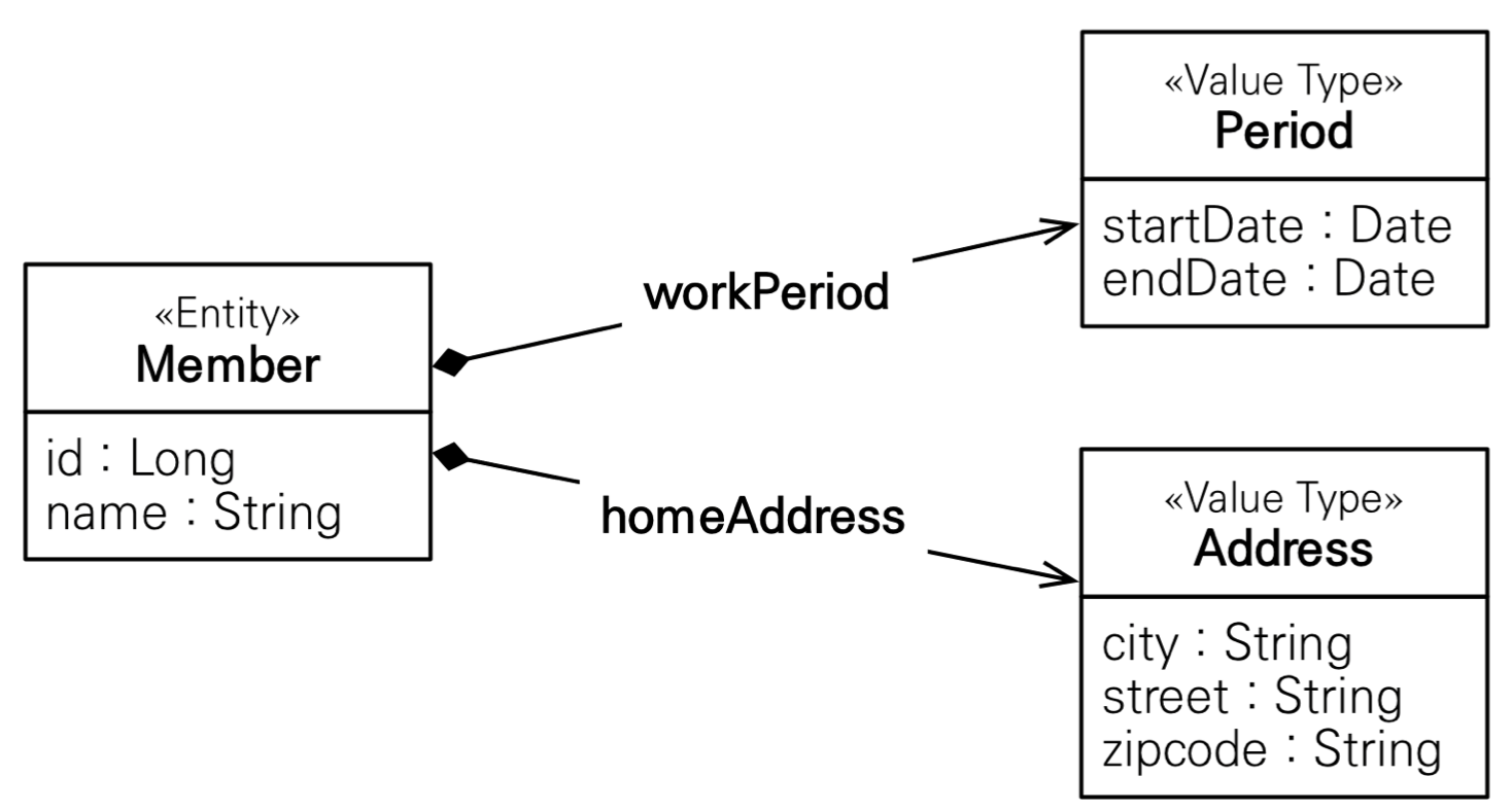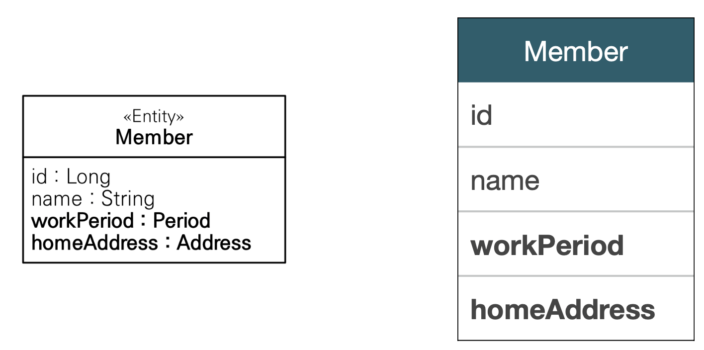 - 다음과 같이 회원 엔티티는 이름, 근무 기간, 집 주소를 가진다. → 좀더 추상화를 해봤다.