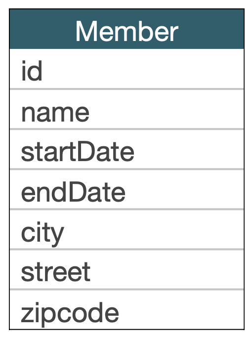 - 회원 엔티티는 이름, 근무 시작일, 근무 종료일, 주소 도시, 주소 번지, 주소 우편번호를 가진다.